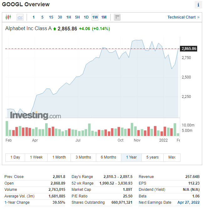 아래 보시는 것이 1년간의 주가 흐름입니다. 코로나 상황이였지만 꾸준하게 성장을 지속했습니다. 현재 2월 4일 기준 2,865 달러로 장을 마감한 상태입니다. 지난해 4분기 매출은 753억 3천만 달러(81조 739억 원)로 전년 동월 대비 32% 증가 수치라고 합니다. 대부분은 온라인 광고수익이고 612억 4천만 달러(74조 391억 원)이라고 합니다.