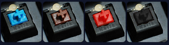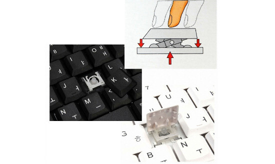기계식 키보드의 핵심은 스위치다. 스위치의 구조와 장착한 스프링의 강도에 따라 기계식 키보드의 종류를 나눈다. 청축, 갈축, 흑축, 적축 등의 스위치 방식이 있으며 보통 클릭, 넌클릭, 리니어 등으로 구분하는데, 스위치의 복원력에 대한 표현이다. 예컨대 키압이 높고 클릭했을 때 ‘찰칵’ 소리가 나는 청축은 클릭, 부드럽게 쑥 눌리는 흑축/적축은 ‘리니어’다. 청축보다 소음이 적은 갈축은 ‘넌클릭’으로 불린다. 소리로 표현하면 청축-찰칵찰칵/ 갈축-또각/ 적축-사각/ 흑측-서거서걱 거린다고 다들 표현을 한다. 소음순으로 청축이 가장 소음이 크다. 그만큼 타자를 치는 맛이 있다고 한다.