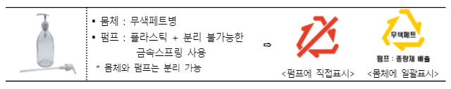 제품 전체가 아니라 일부 구성 부분이 도포·첩합 표시 대상이라면 제품 전체에는 재활용 마크를 붙이고, 재활용이 불가능한 부분에 따로 도포·첩합 표시를 해서 각각 분리배출할 수 있게 했다.